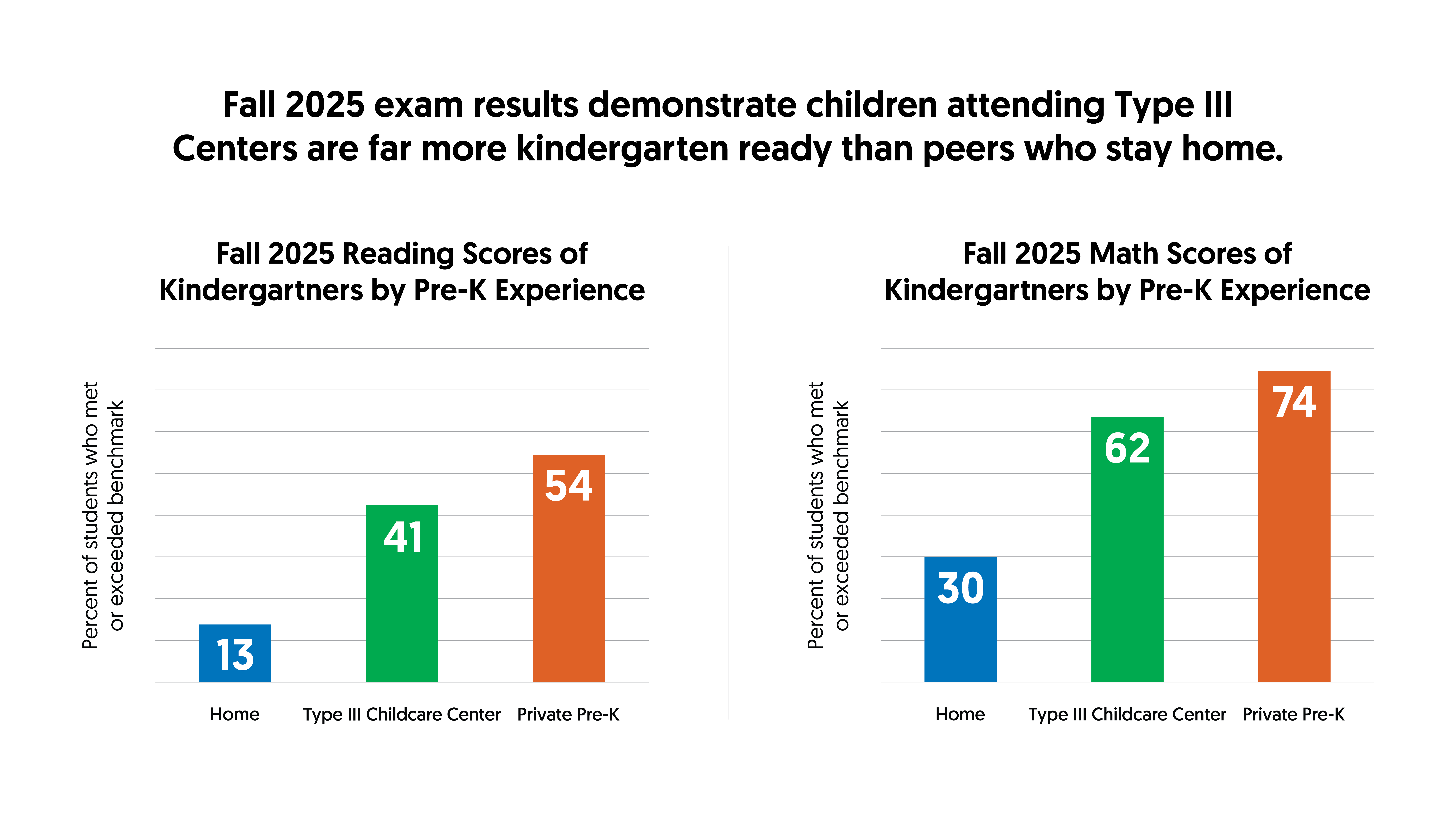 Research shows high-quality early education during the first three years of life is vital for healthy brain development and long-term academic and life success. Four years of data demonstrate investments in Caddo Parish ECE have positively impacted children and families. Fall 2025 assessments of children entering kindergarten in Caddo revealed those who attended Type III childcare centers performed 28% better in reading and 32% better in math than children who remained at home during this crucial developmental stage.
