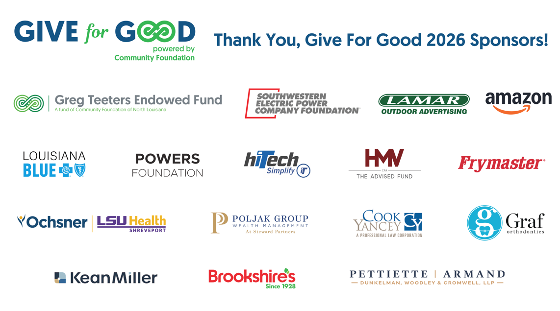Generous community sponsors help make Give For Good possible. CFNLA thanks our 2026 sponsors: Greg Teeters Endowed Fund, AEP SWEPCO Foundation; Lamar Outdoor Advertising; Amazon; Blue Cross Blue Shield Louisiana (Louisiana Blue); Powers Foundation; HiTech; Heard, McElroy & Vestal LLC; Frymaster; Ochsner LSU Health Shreveport; Poljak Group Wealth Management at Steward Partners; Cook, Yancey, King & Galloway; Graf Orthodontics; Kean Miller; Brookshire’s Grocery Co; and Pettiette, Armand, Dunkelman, Woodley & Cromwell LLP.
